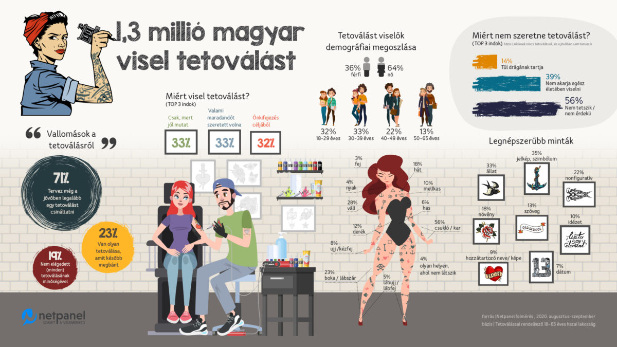 És hogy miért tetováltatnak az emberek? Legtöbben egyszerűen azért, mert dekoratívnak tartják, de sokan döntenek így önkifejezés céljából is, vagy azért, mert valami maradandót szeretnének. Ugyanakkor az is kiderült, hogy minden ötödik embernek van olyan tetoválása, amit kifejezetten megbánt, és körülbelül ugyanennyien állítják, hogy nem teljesen elégedettek az elkészült mű minőségével. Mindezekkel együtt úgy tűnik, hogy akinek már van, az nem áll meg egynél, ugyanis 71 százalék azok aránya, akik terveznek még legalább egy újabb tetoválást.